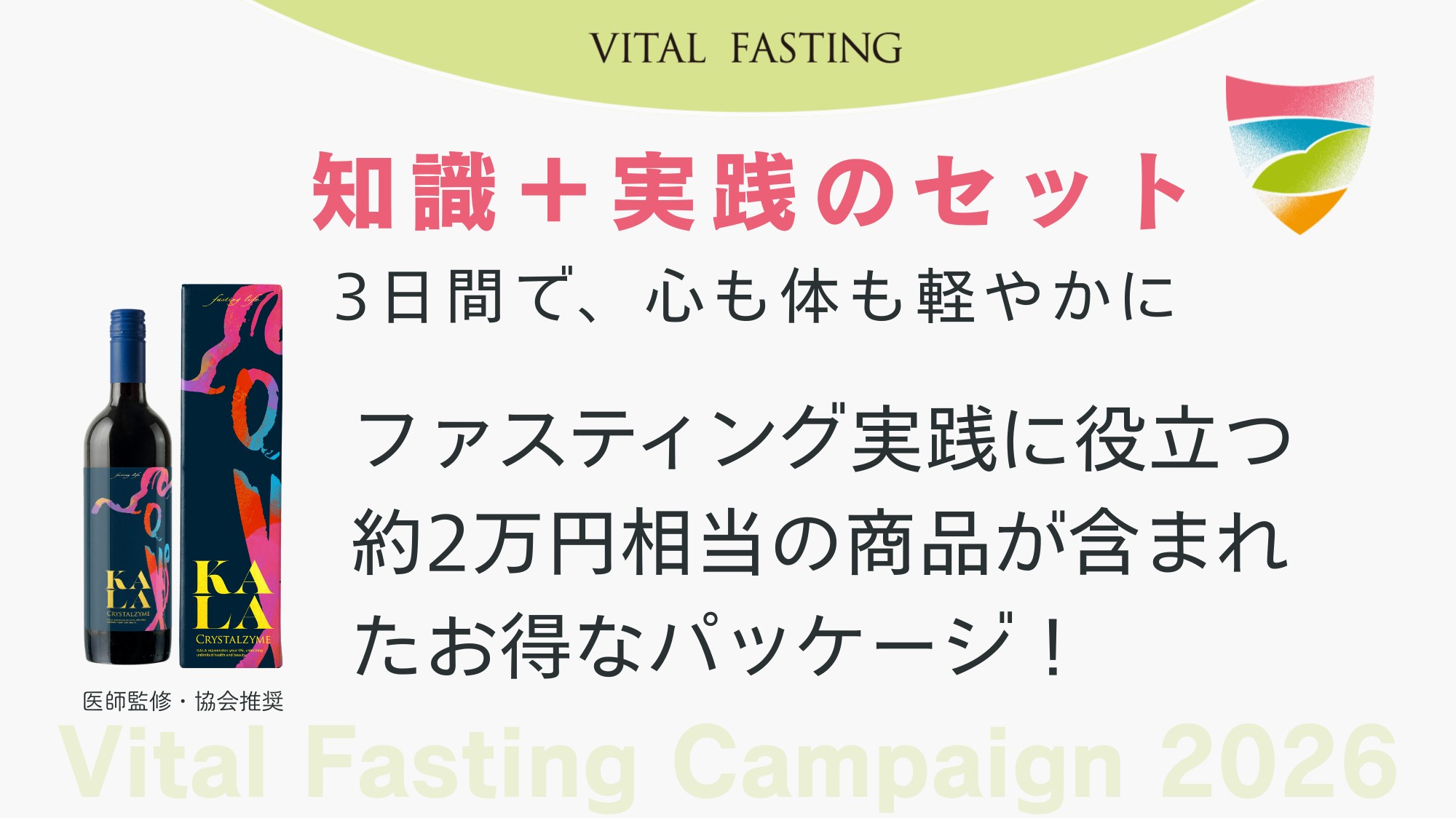 初級検定の受講料金の中に、3日間のファスティング実践が可能な医師監修&協会推奨のファスティング専用ドリンク”クリスタルザイムKALA”約2万円相当がセットになっていてお得に! (新KALAは2026年2月17日以降発送分より対象です)
